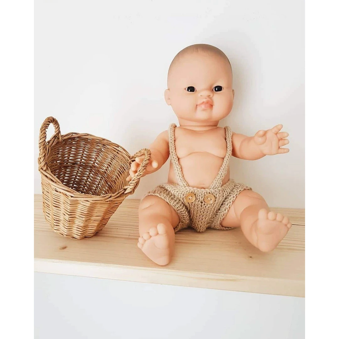The sweetest asian baby boy minikane doll. Minikane Dolls are made from eco-friendly and non-toxic vinyl. They are subtly scented with a vanilla scent and are small enough for your little one to hold. Your little one can dress them up with their own baby clothes or choose from the Minikane outfits.Â