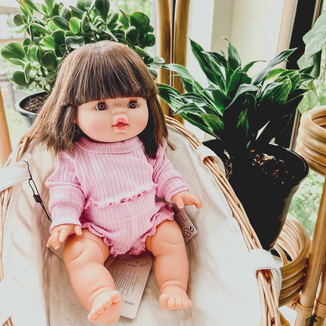 The sweetest baby girl minikane doll. Minikane Dolls are made from eco-friendly and non-toxic vinyl. They are subtly scented with a vanilla scent and are small enough for your little one to hold. Your little one can dress them up with their own baby clothes or choose from the Minikane outfits.Â