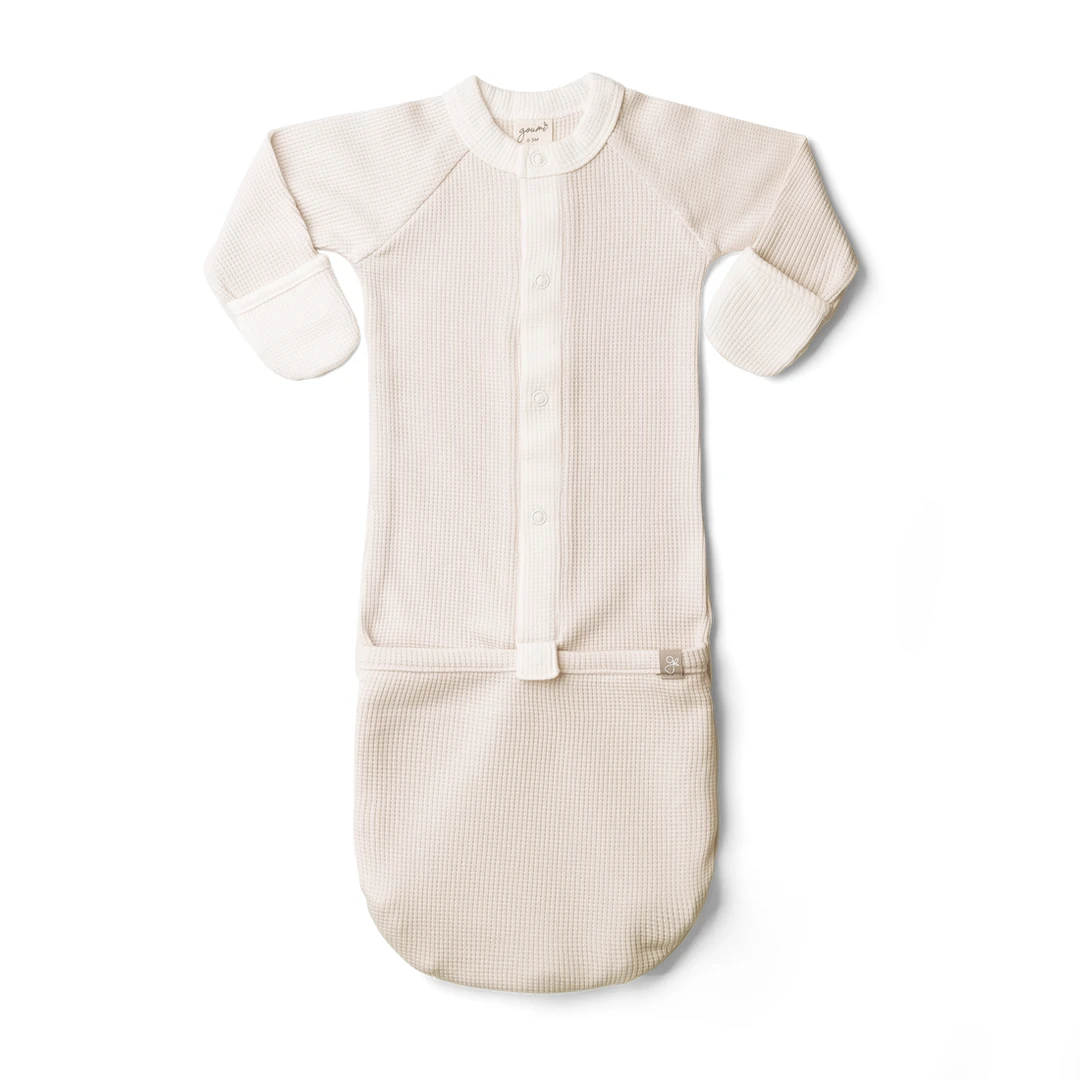 signature integrated mitts with pattern to boost brain development and prevent scratches plus a one-snap foot pocket to quickly change from gown to sleeper (perfect for those 2am diaper changes
