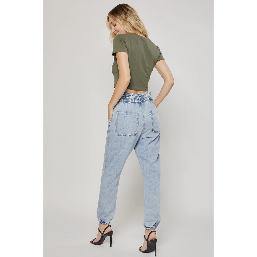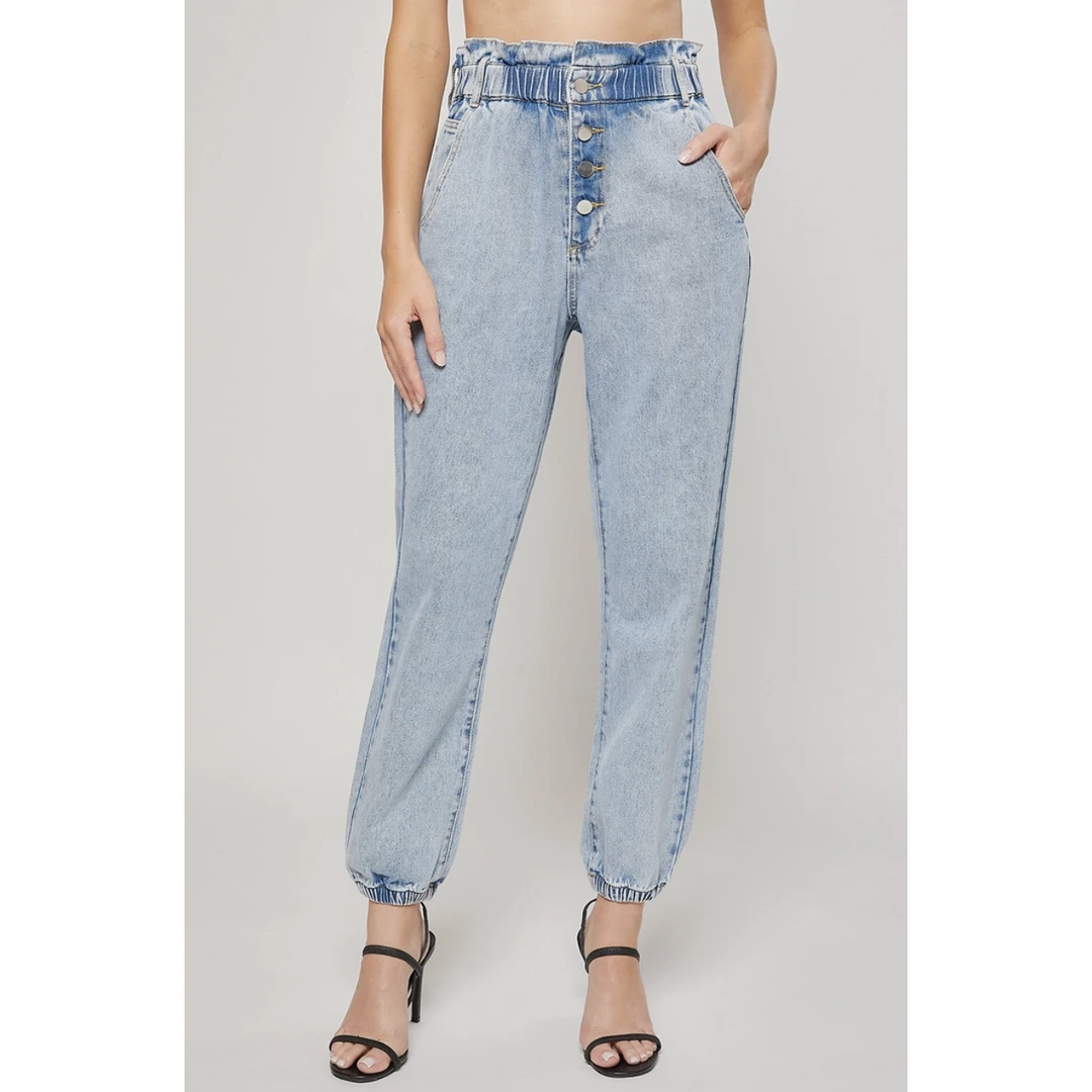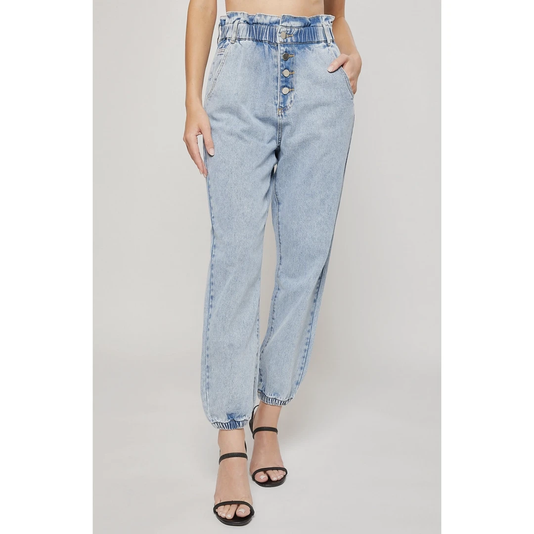 high-rise paperbag waist +non-stretch cotton fabric + buttoned fly