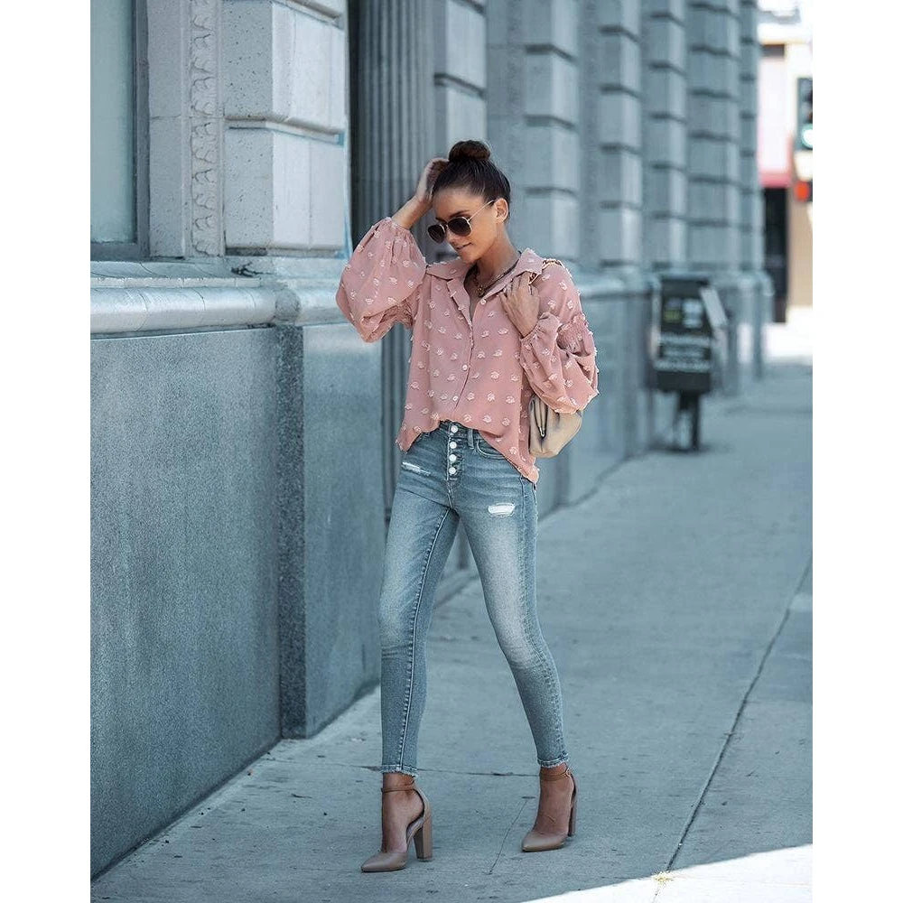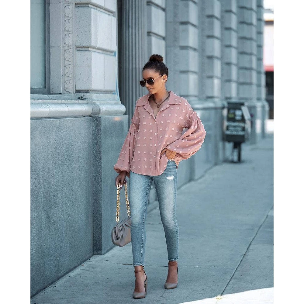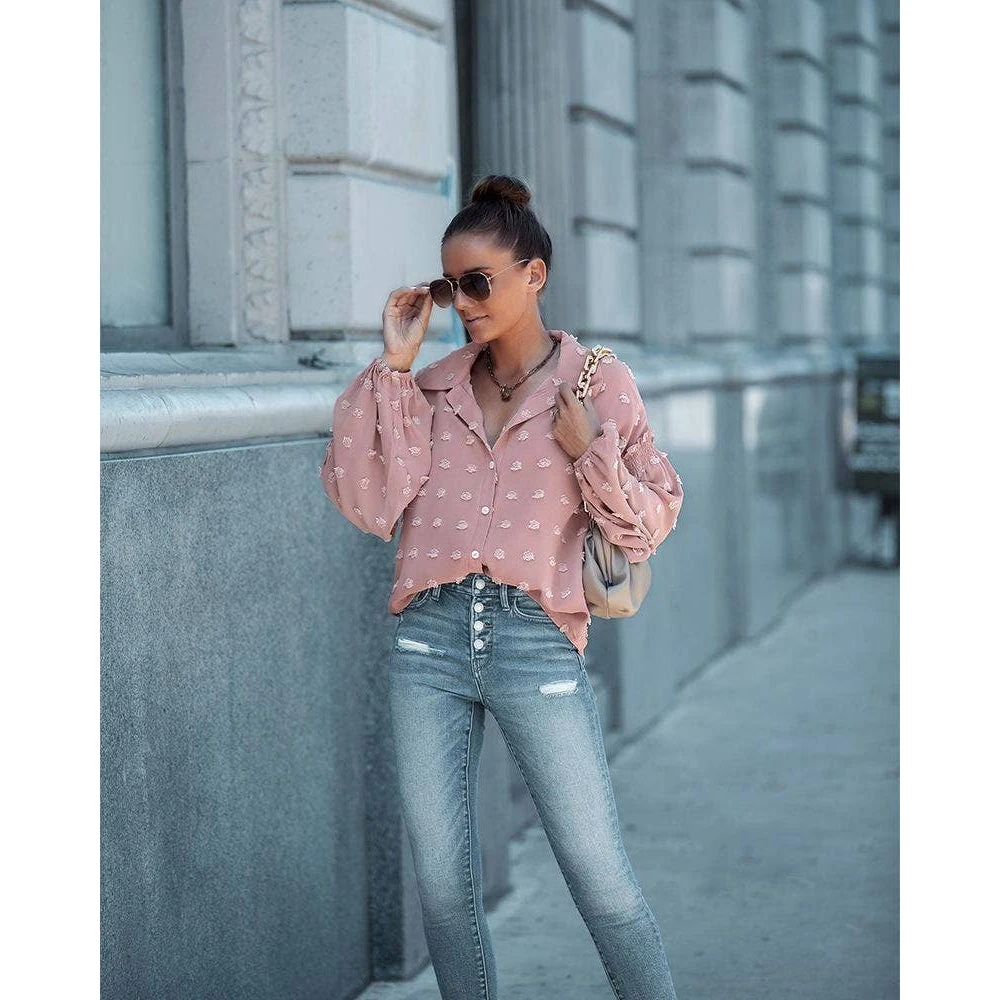 J+j Pink Swiss Dot Bishop Sleeve Button Blouse Tops