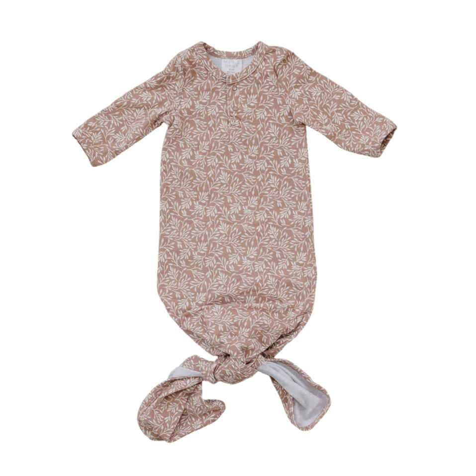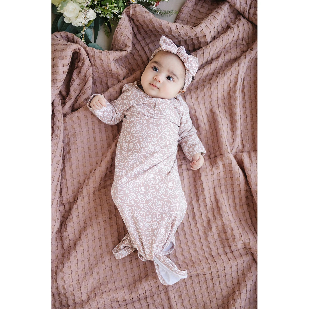 Mebie Baby Dusty Rose Vines Organic Cotton Knotted Gown Preemie + Newborn