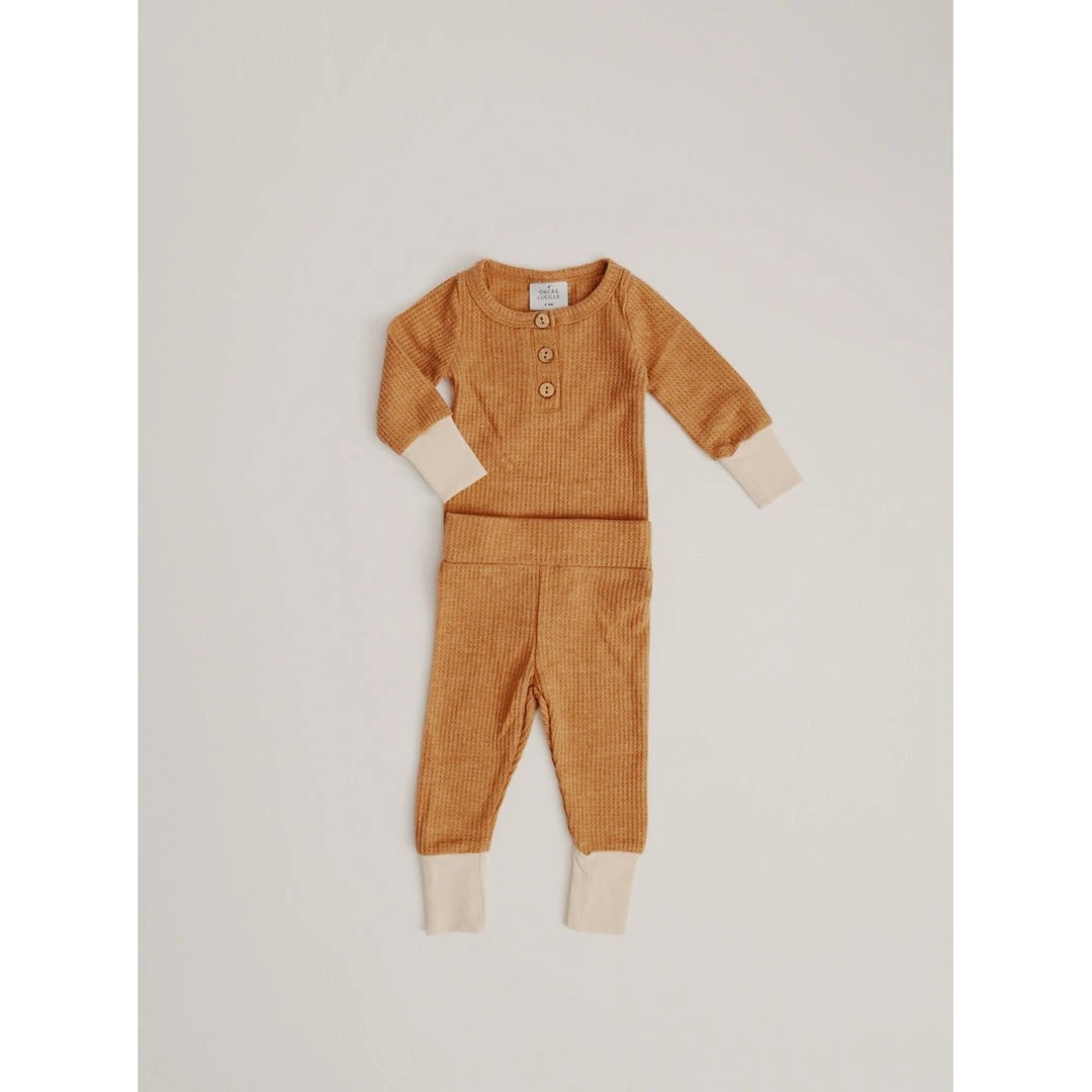 A comfy, soft henley shirt and pants set in a waffle knit fabric. Features extended arm and leg cuffs in cream.