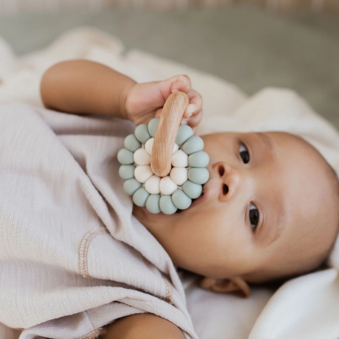 Tip: Our natural beechwood ring helps relieve achy gums and helps budding teeth pop through.